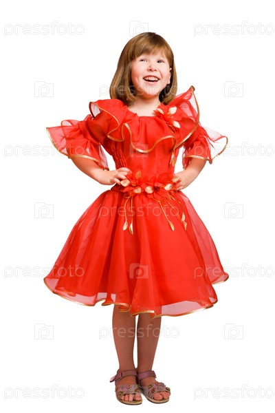 Смеющаяся девочка в праздничном платье, изолированная на белом фоне