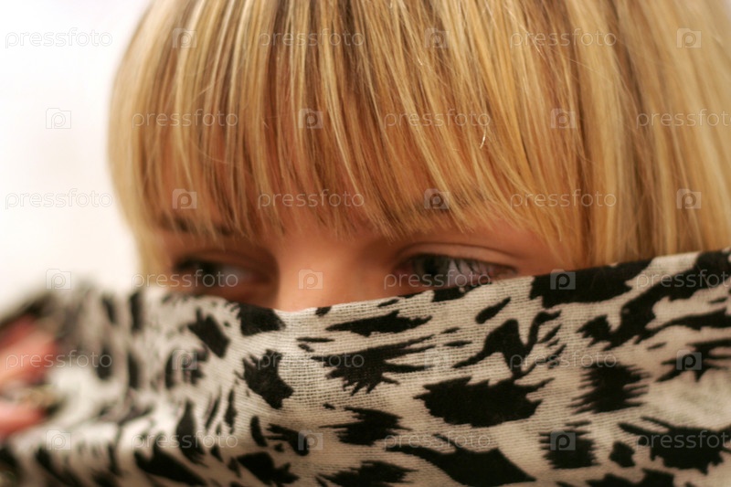 Портрет светловолосой девушки с пятнистым шарфом крупным планом