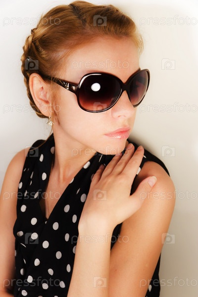 Портрет девушки в солнцезащитных очках на светлом фоне