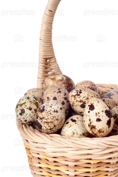 Перепелиные яйца в корзине на белом фоне
