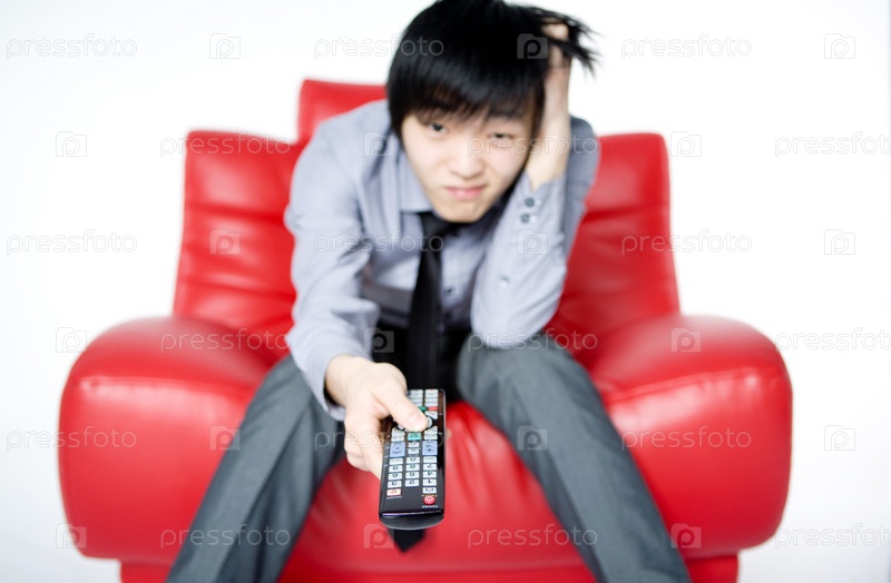 Усталый молодой человек в серой рубашке смотрит телевизор