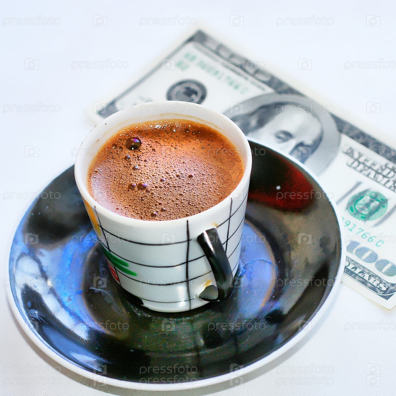 Чашка кофе и стодолларовая купюра крупным планом