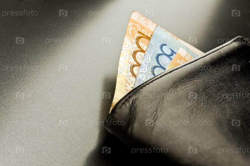 Бумажник с банкнотами на сером фоне