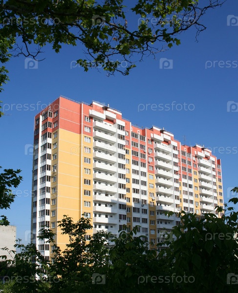 Вид на яркий многоэтажный дом