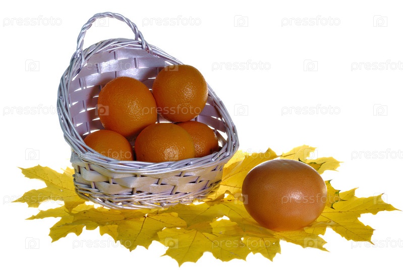 Апельсины в плетеной корзине на желтых кленовых листьях, изолированные на белом фоне