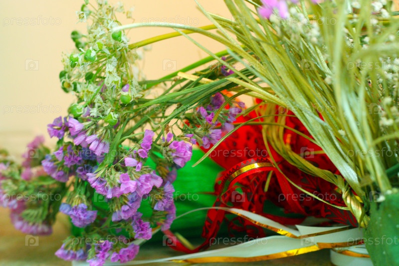 Мелкие сиреневые и белые цветы и материал для оформления букета