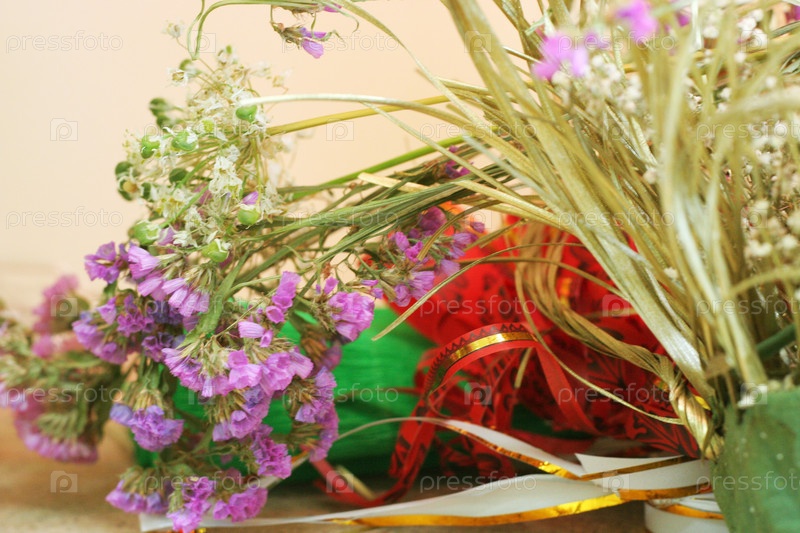 Мелкие сиреневые и белые цветы и материал для составления букета