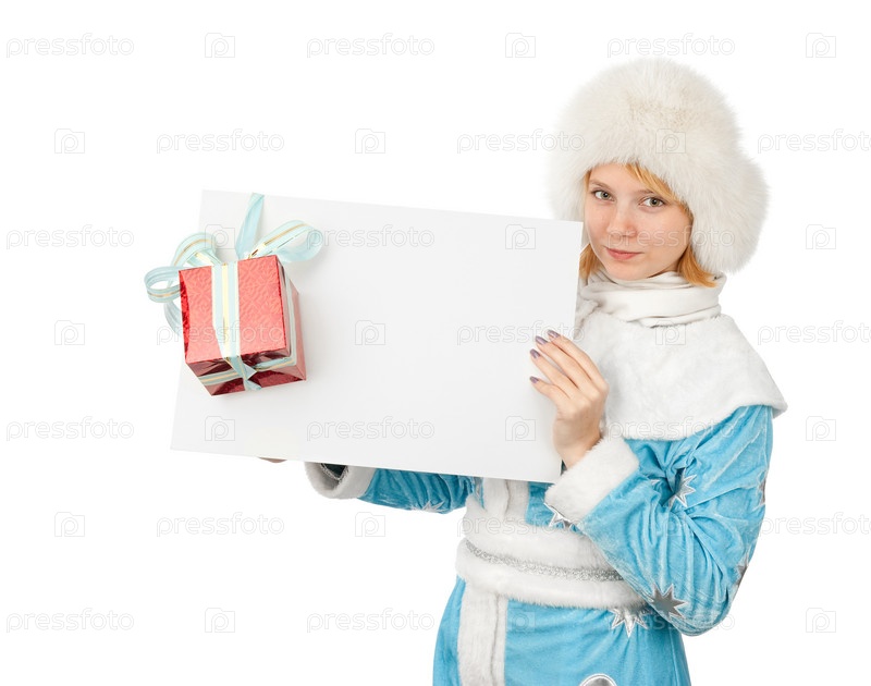 Девушка в новогоднем костюме держит лист бумаги с подарком