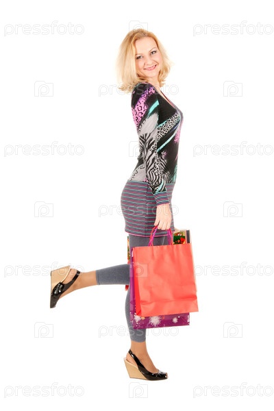 Портрет молодой женщины с пакетами в руках на белом фоне