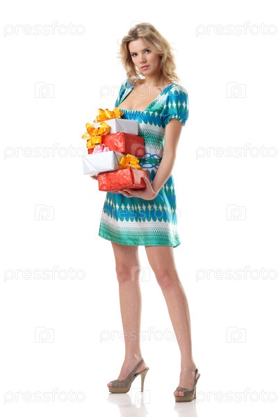 Портрет молодой женщины с подарками в руках на белом фоне