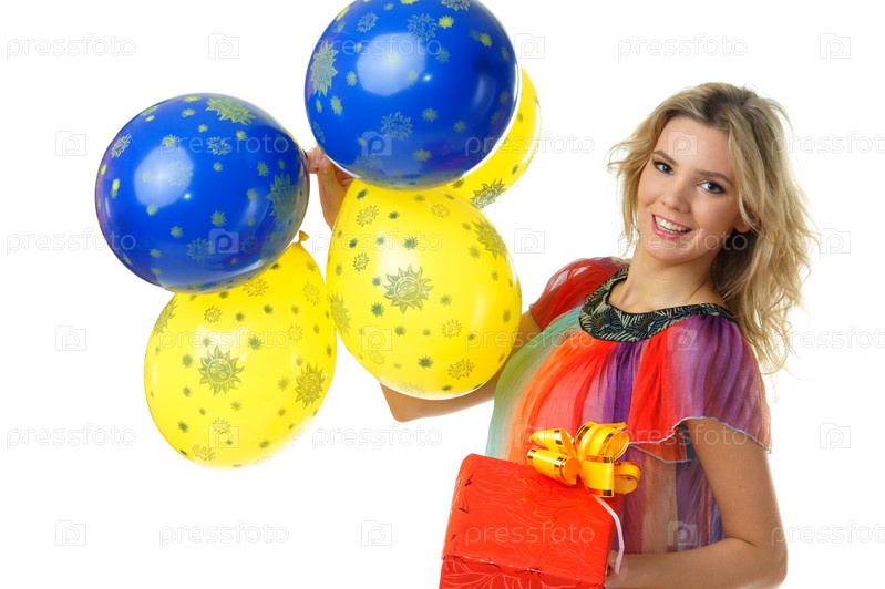 Молодая девушка с шариками и подарком на белом фоне