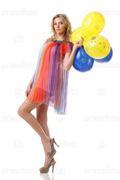 Очаровательная молодая женщина с воздушными шарами в руке на белом фоне