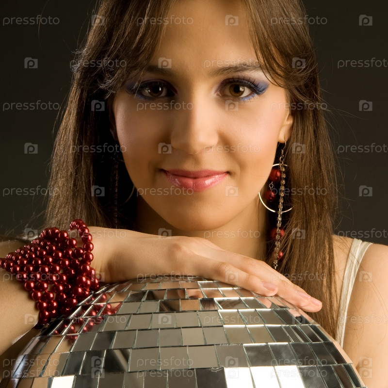 Портрет красивой девушки с зеркальным шаром на черном фоне