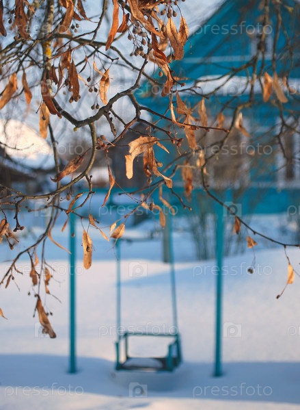 Ветка дерева на фоне качелей и сельского дома зимой