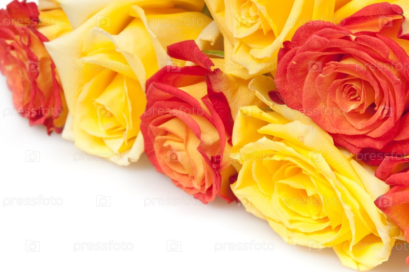 Красные и желтые розы крупным планом на белом фоне