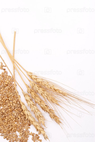 Колосья и зерна пшеницы на белом фоне