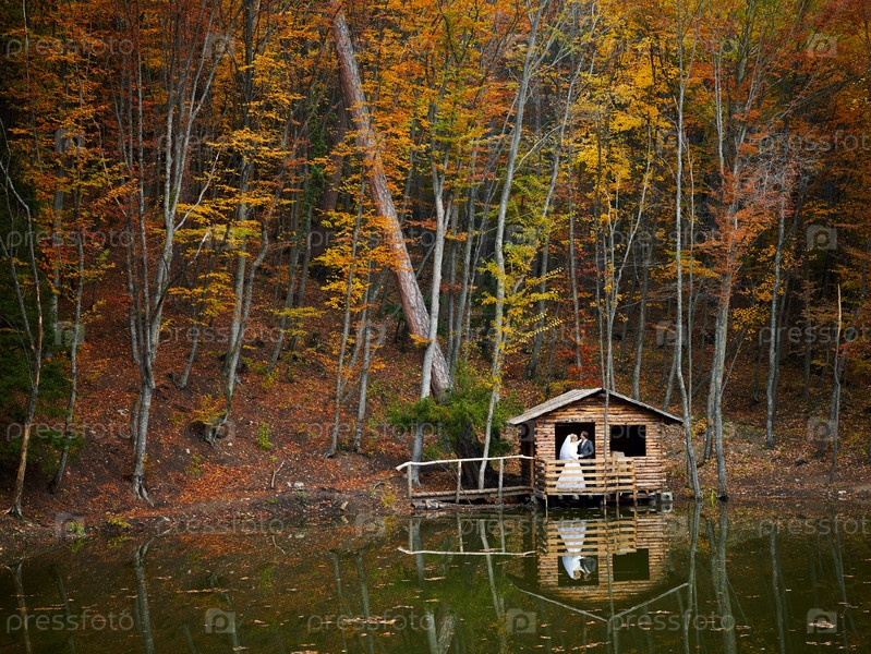 Жених и невеста в лесной избушке на берегу озера