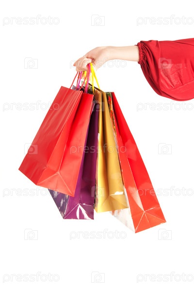 Рука с бумажными пакетами крупным планом на белом фоне