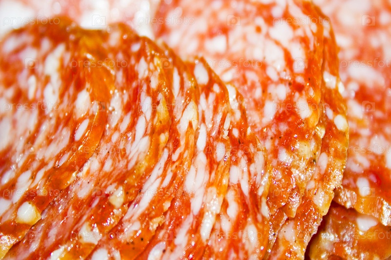 Кусочки копченой колбасы крупным планом