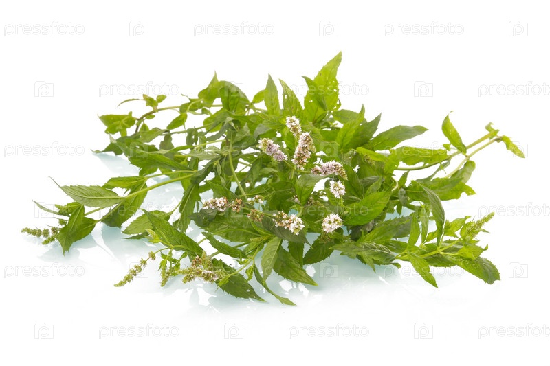 Цветущие веточки мяты на белом фоне