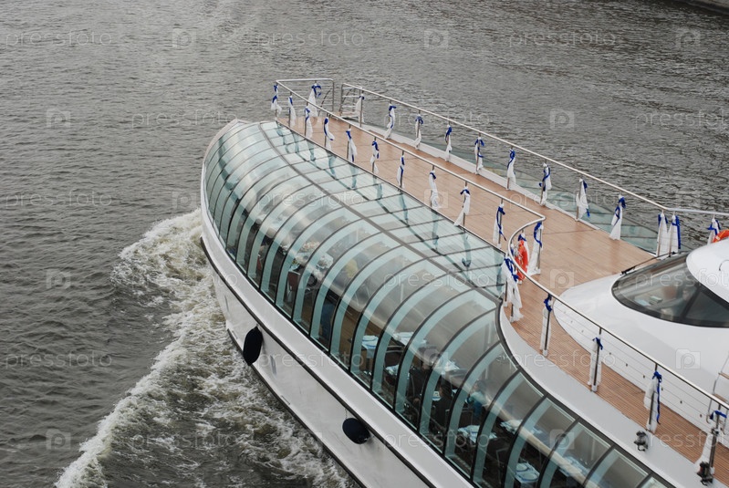 Белый корабль со стеклянной крышей, рассекающий волны