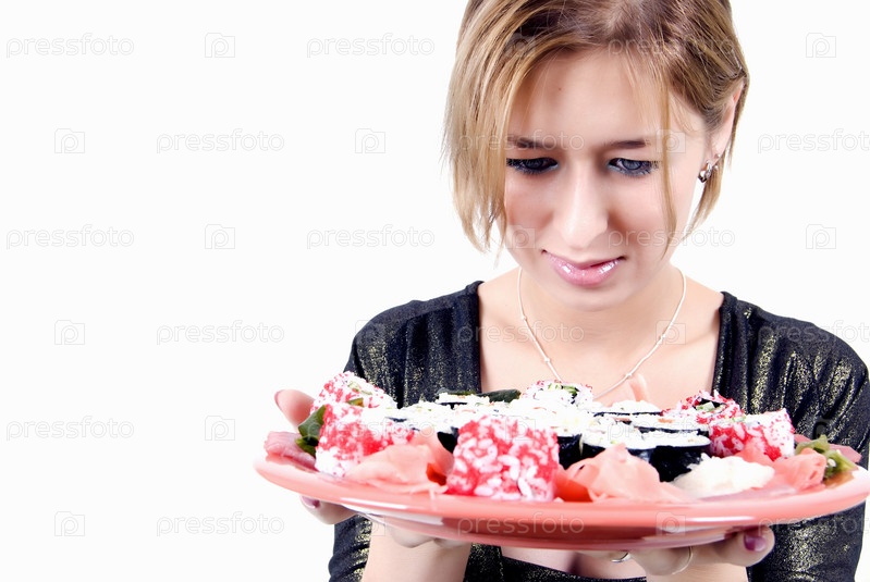 Молодая девушка с набором суши на белом фоне