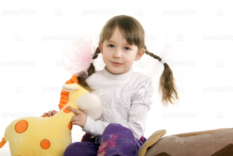 Маленькая девочка играет с мягкими игрушками