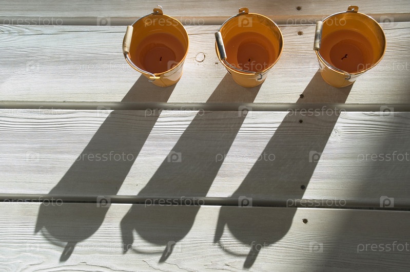 Три оранжевых подсвечника в форме ведерок с тенью на белом деревянном полу