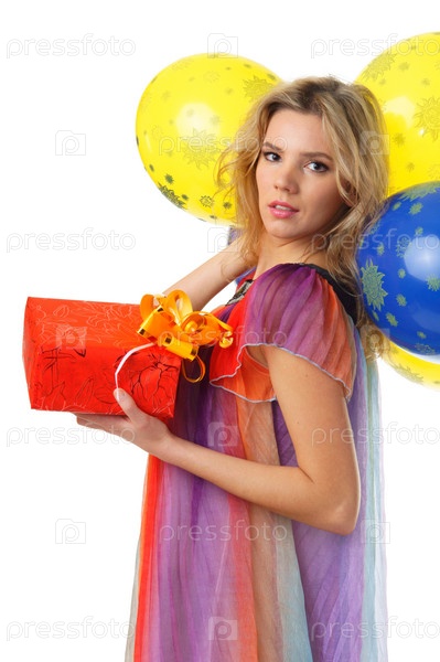 Симпатичная блондинка с воздушними шарами и подарком