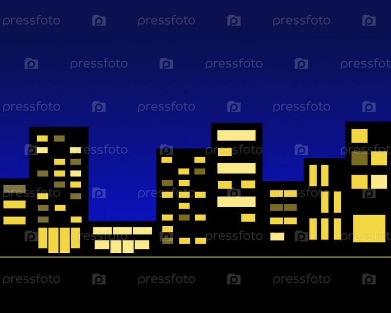 Иллюстрационные силуэты ночных зданий города сияют окнами