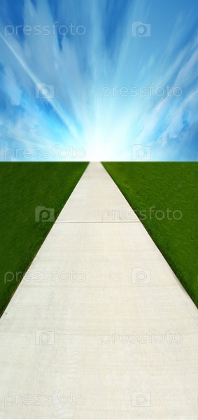 Бетонная дорога, зеленое поле и небо