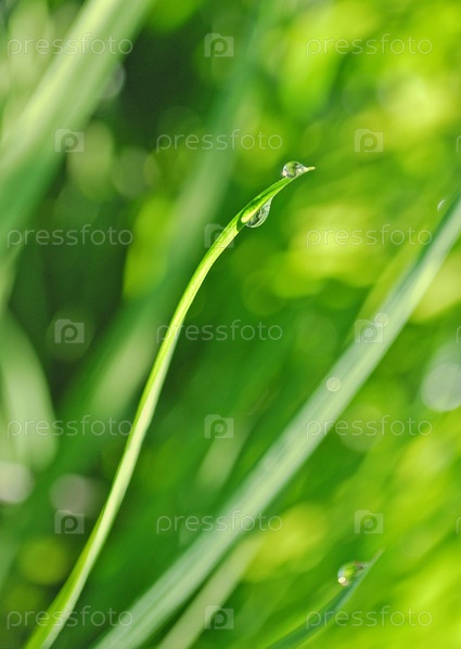 Капли росы на свежей траве, абстрактный зеленый фон