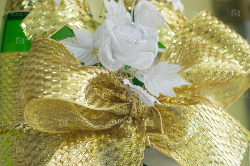 Белые цветы и золотая лента, украшающие свадебные бутылки шампанского