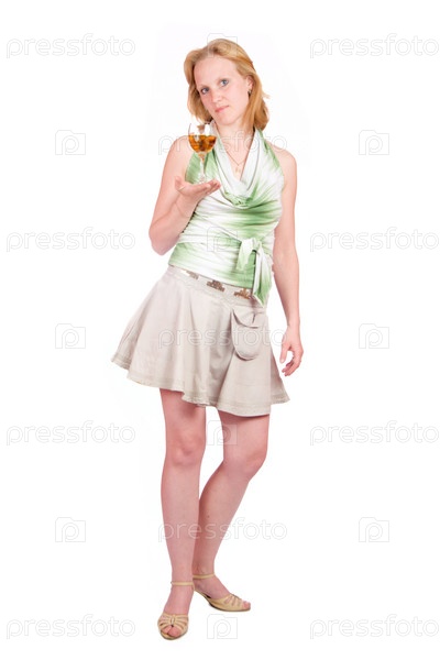 Молодая девушка с бокалом в руках на белом фоне