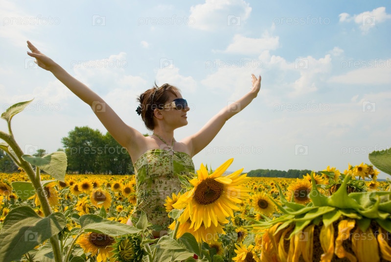Молодая девушка среди желтых подсолнухов