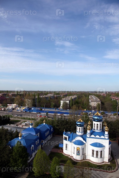 Православная белокаменная церковь на фоне городских улиц, вид сверху