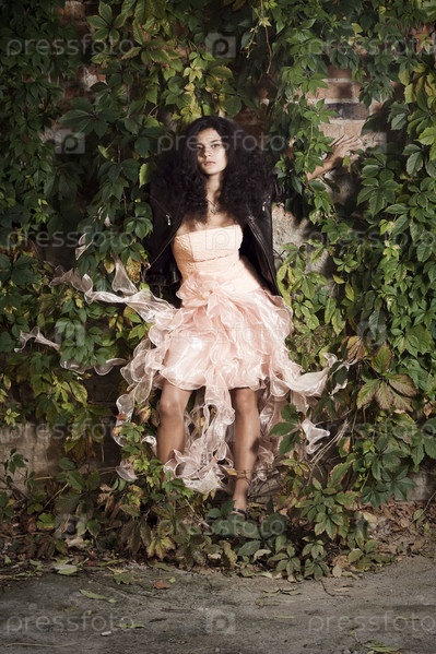 Девушка в вечернем платье и кожаной куртке стоит у стены, обвитой виноградом