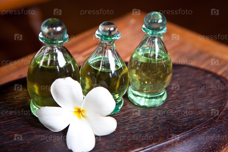 Белый цветок и эфирное масло в бутылках крупным планом