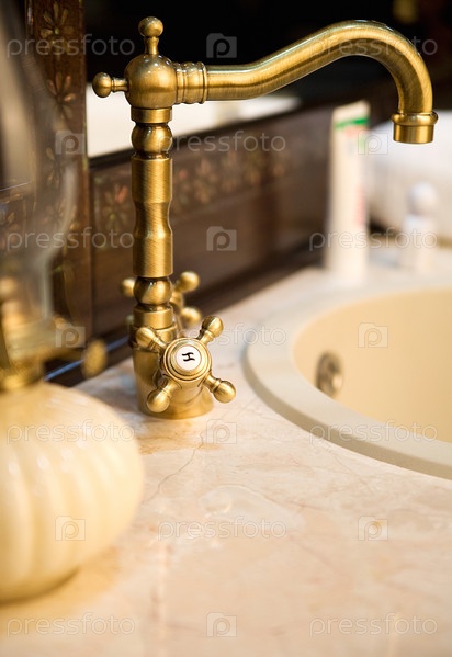 Старинный водопроводный кран на фоне зеркала. Ванная комната