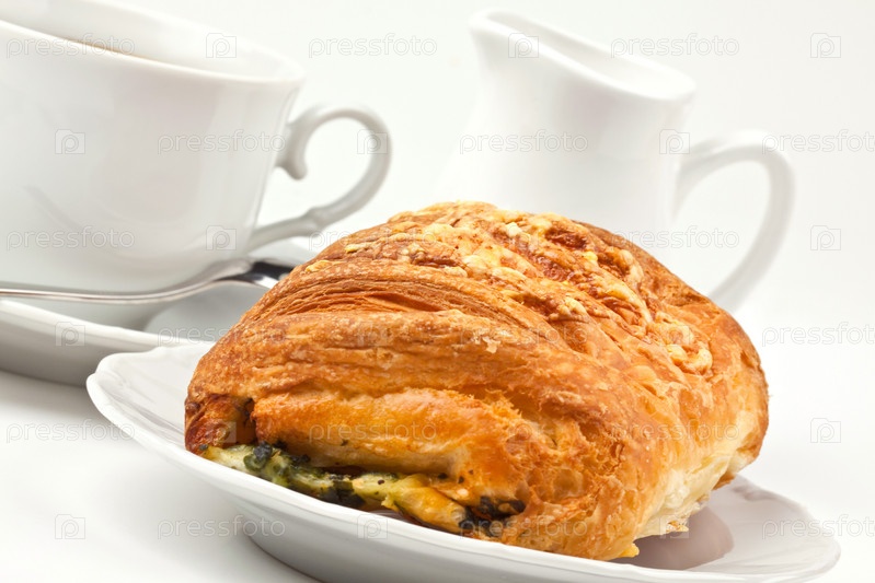 Чашка кофе и булочка с сыром и шпинатом на белом фоне