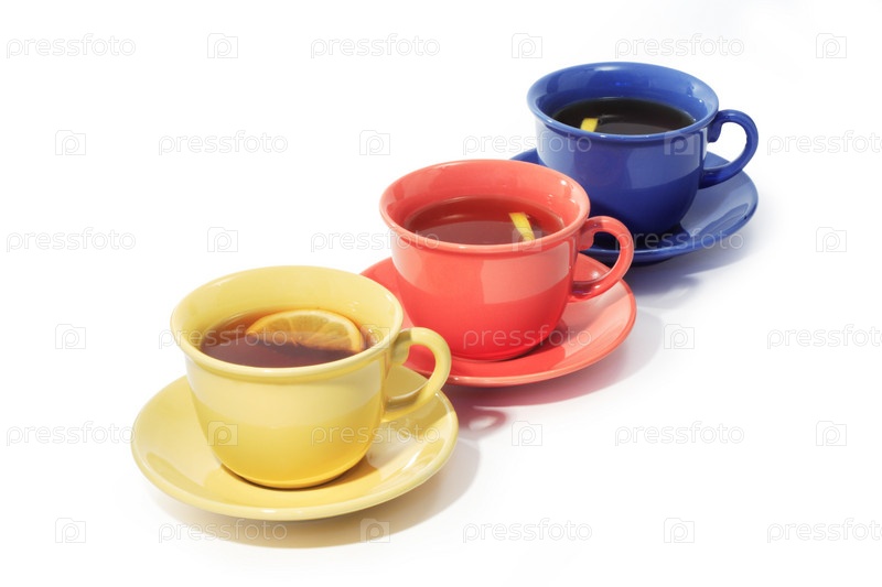 Три чашки черного чая с лимоном на белом фоне