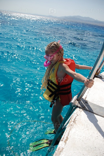 Девочка в маске с трубкой для подводного плавания спускается в море