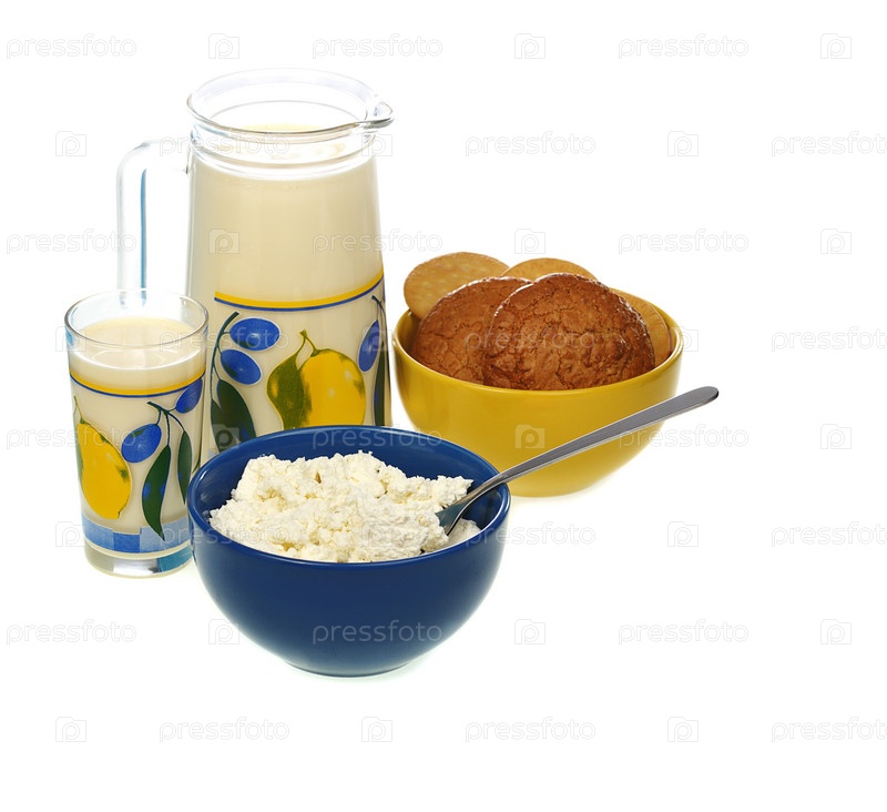 Кувшин с молоком, печенье и творог на белом фоне