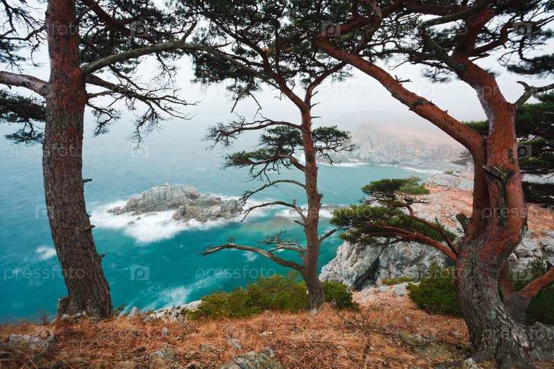 Красивый вид на море через извилистые сосны
