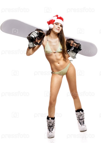 Девушка в купальнике и новогоднем колпаке со сноубордом