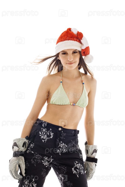 Девушка в купальнике и в новогоднем колпаке