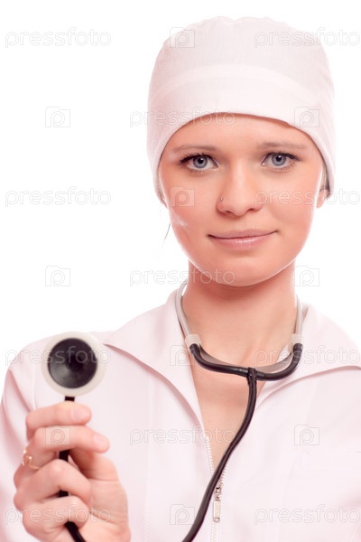 Девушка-терапевт держит в руках стетоскоп