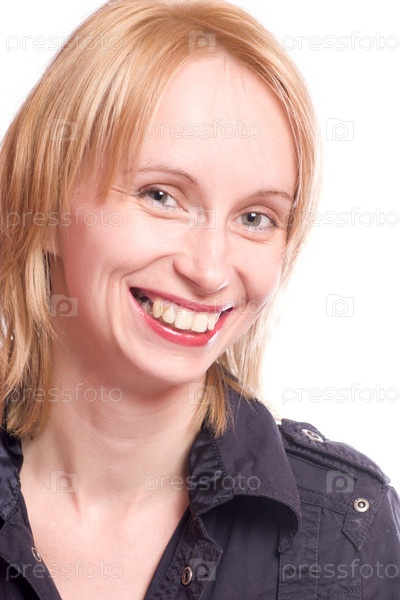 Портрет смеющейся девушки со светлыми волосами на белом фоне