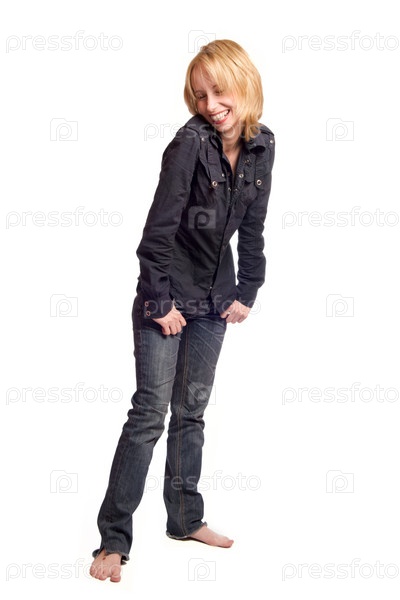 Смеющаяся девушка в повседневной одежде на белом фоне