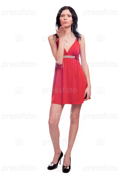 Молодая девушка в красном платье посылает воздушный поцелуй